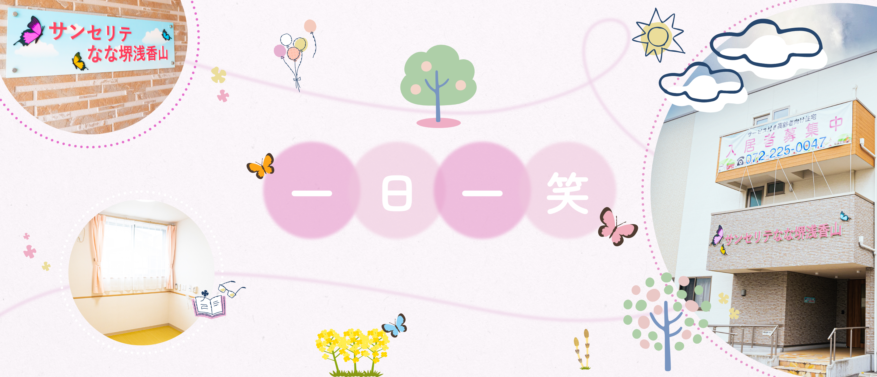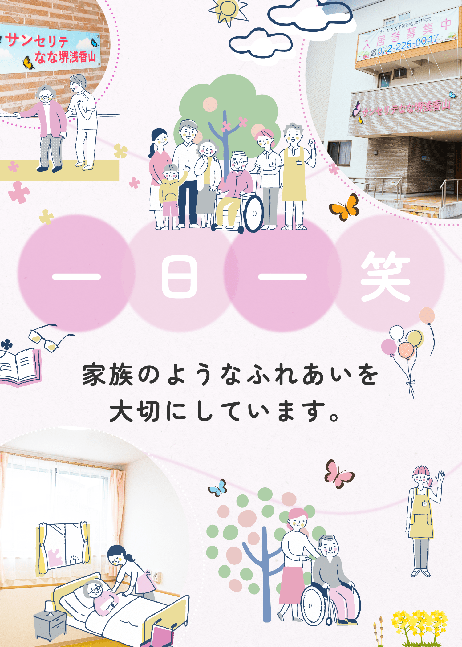 ご利用者様はもちろんのこと、ご家族様にもご安心いただける介護を目指す優良館。訪問介護サービス・居宅介護サービスを提供する『ななケアサポート』に加え、2018年にはサービス付高齢者向け住宅 『サンセリテなな泉大津』が、翌年には『サンセリテなな堺浅香山』がオープンしました。